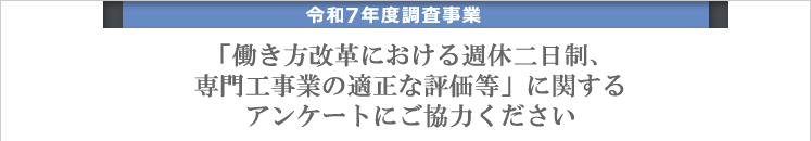 当連合会では、平成30年度から実施している「働き方改革における週休二日制、専門工事業の適正な評価」に関する調査を今年度も実施することといたしました。お手数ではございますが、調査にご回答くださいますようお願いいたします。 注)調査結果は、ご回答企業が特定されるような形で公表されることはございませんので、実態等を率直にご記入下さい。 --------------------------------------------------------------------------- 【回答期限】 2025年12月8日(月)17:00 --------------------------------------------------------------------------- |
